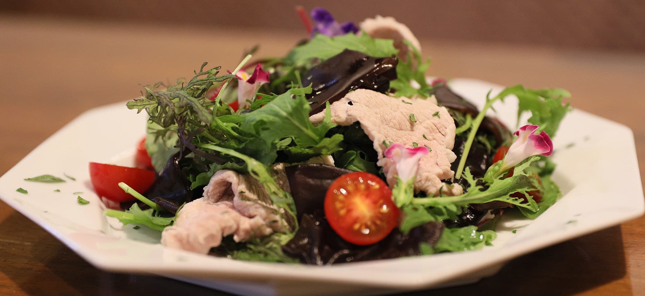 豚しゃぶサラダにきくらげをプラスし、食感を味わいながらヘルシーで栄養価の高い一品になります。
